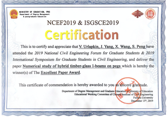 2020-07-16由船建学院土木系杨健教授指导,Urlpakin、王星尔、彭沈楠参与的研究项目“Numerical study of hybrid timber-glass I-beams on pegs”同时荣获主办方设立的优秀论文奖、最佳学术创新奖、优秀表达奖三项大奖。该项目以数值仿真为主要研究手段,深入研究木-玻璃复合梁在木栓连接情况下的受力性能和破坏模式,论证了新型木-玻璃复合梁的可行性,在绿色土木工程道路上迈出了微小一步。