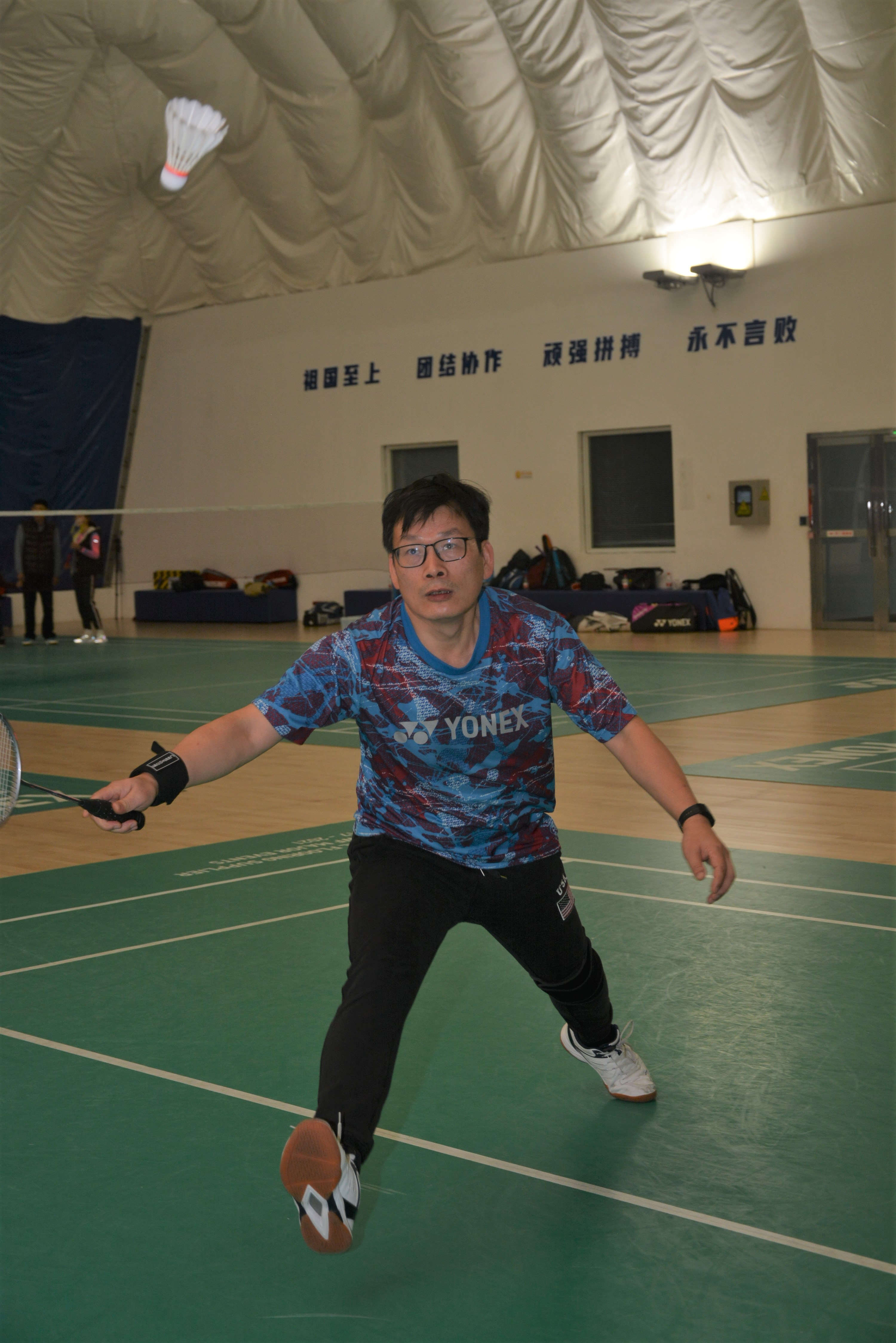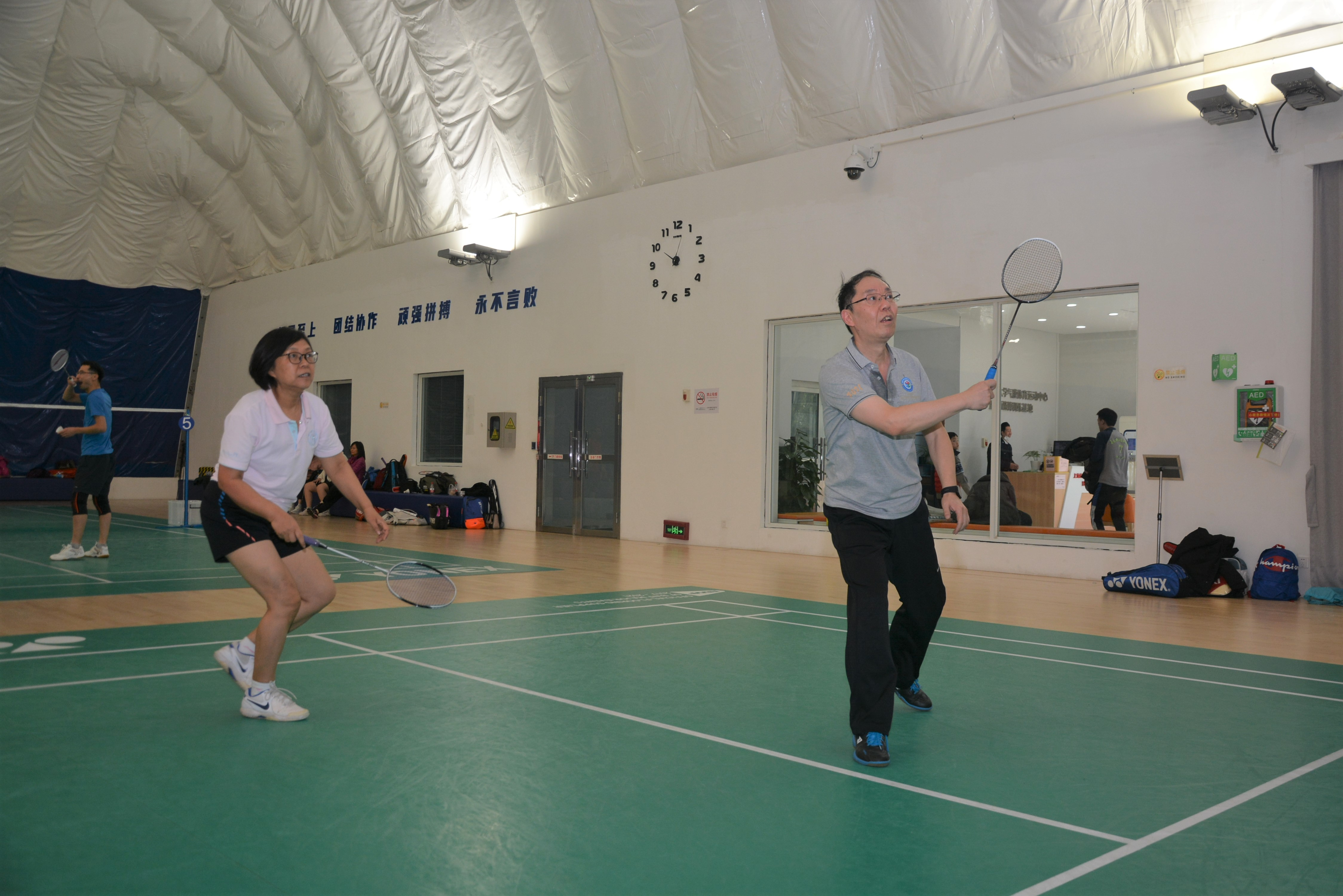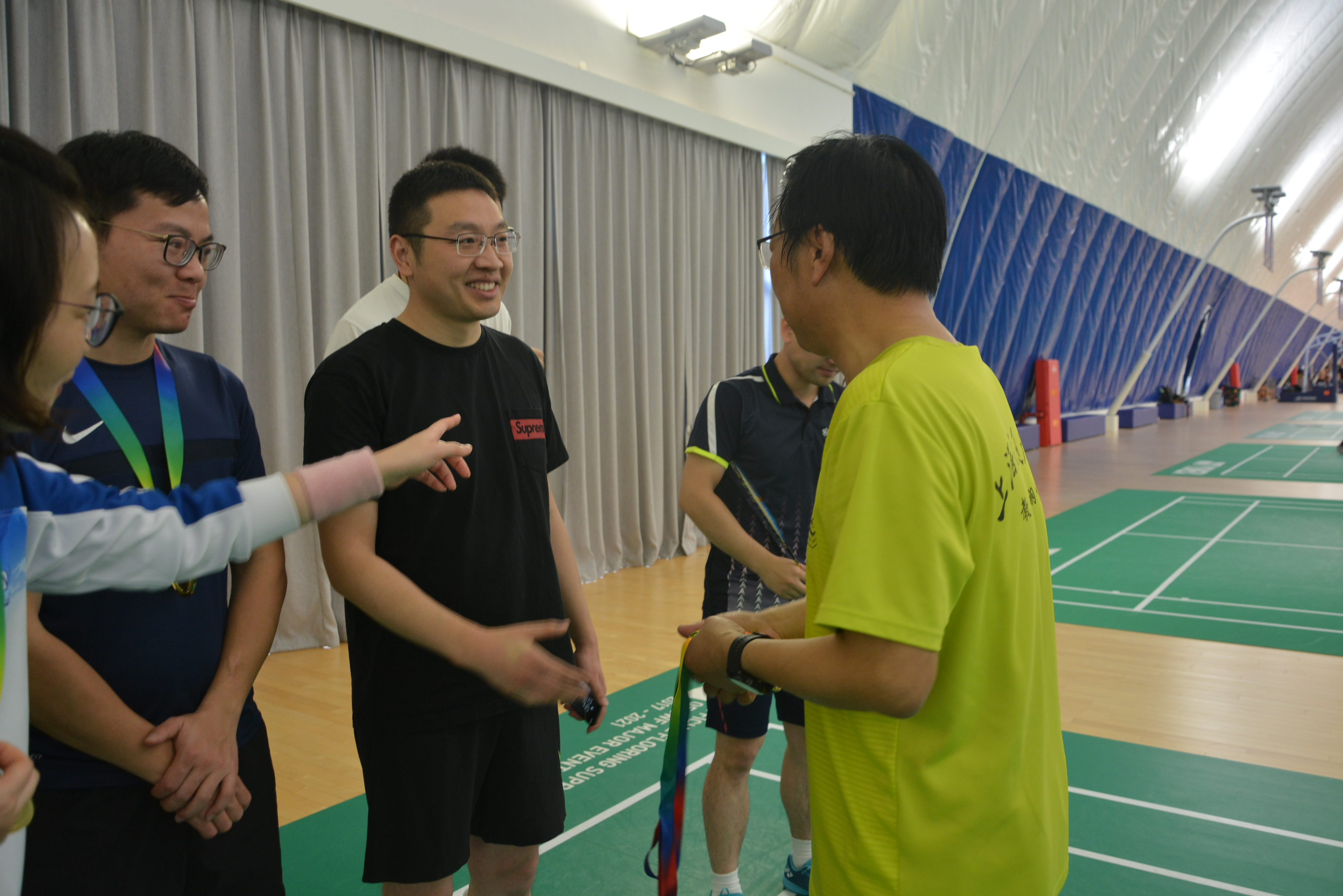 之后是“五羽轮比”趣味赛,由张卫刚、王喜芳、薛鸿祥和赵金城四位老师领队,现场招募选手组成四支五人组队伍,按照“五羽轮比”规则,一方获得10分后双方各替换一名选手进入下一局,以此类推,直到赢得50分。经过激烈的角逐,由薛鸿祥和张卫刚带领的队伍分别获得趣味赛第一、二名,赵金城和王喜芳带领的队伍分别获得三、四名。