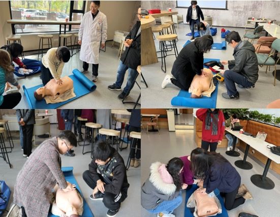 讲座结束后,刘金生院长邀请教职工上台进行现场实践操作,手把手地指导大家。大家在活动中学到了很多实用的应急救护知识,掌握了心肺复苏的实战要领。