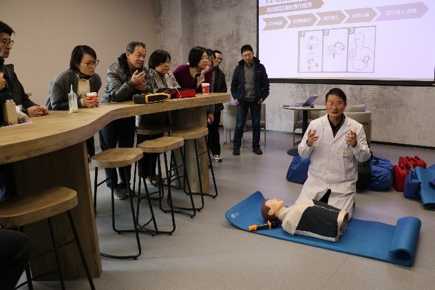 活动中,刘金生院长运用自己的专业知识阐述了救护新概念,并介绍和亲自演示了心肺复苏规范操作、AED自动体外除颤机使用方法等内容,告诫大家遇到突发情况要保持冷静,沉着应对。