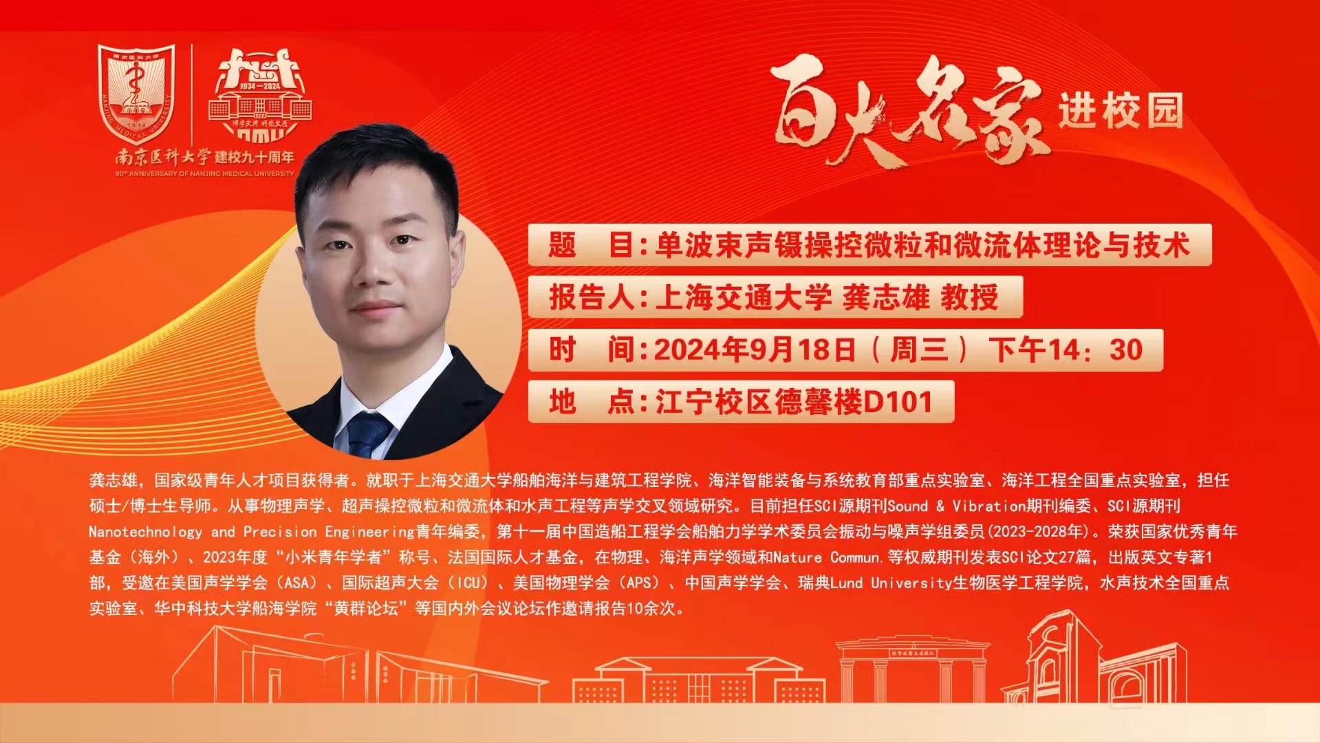 [B15] 龚志雄, 单波束声镊操控微粒和微流体理论与技术, 南京医科大学百大名家进校园学术讲座, September 18, 2024, Nanjing (China).