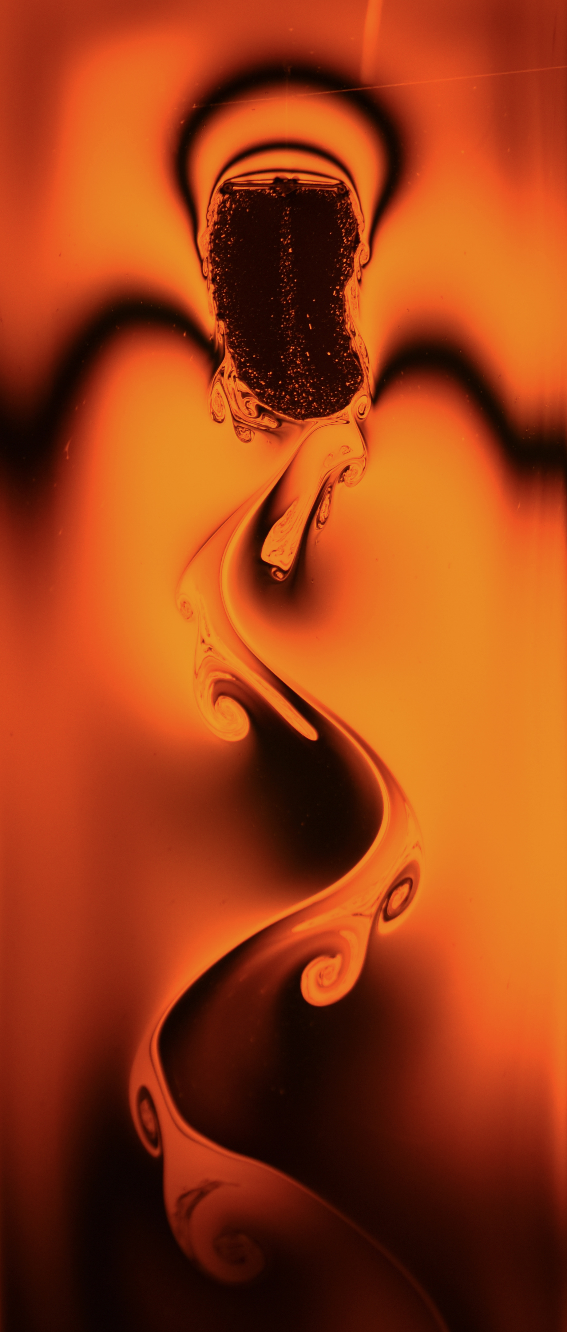 我们在可看作准二维的肥皂膜流场中放置了一个“刚性平板-柔性细丝”系统,像是给平板“穿上了披风”。此耦合系统在流场中表现出优雅而复杂的特性:柔性细丝因肥皂膜的流动而改变自身的形状并随之摆动,摆动的细丝则在流场中留下了清晰的涡街结构,肥皂膜也因为流速的变化形成了明暗可见的干涉条纹。此图像蕴含着“软尾减阻”的奥秘,即平板的阻力会因柔性细丝的存在而减小。