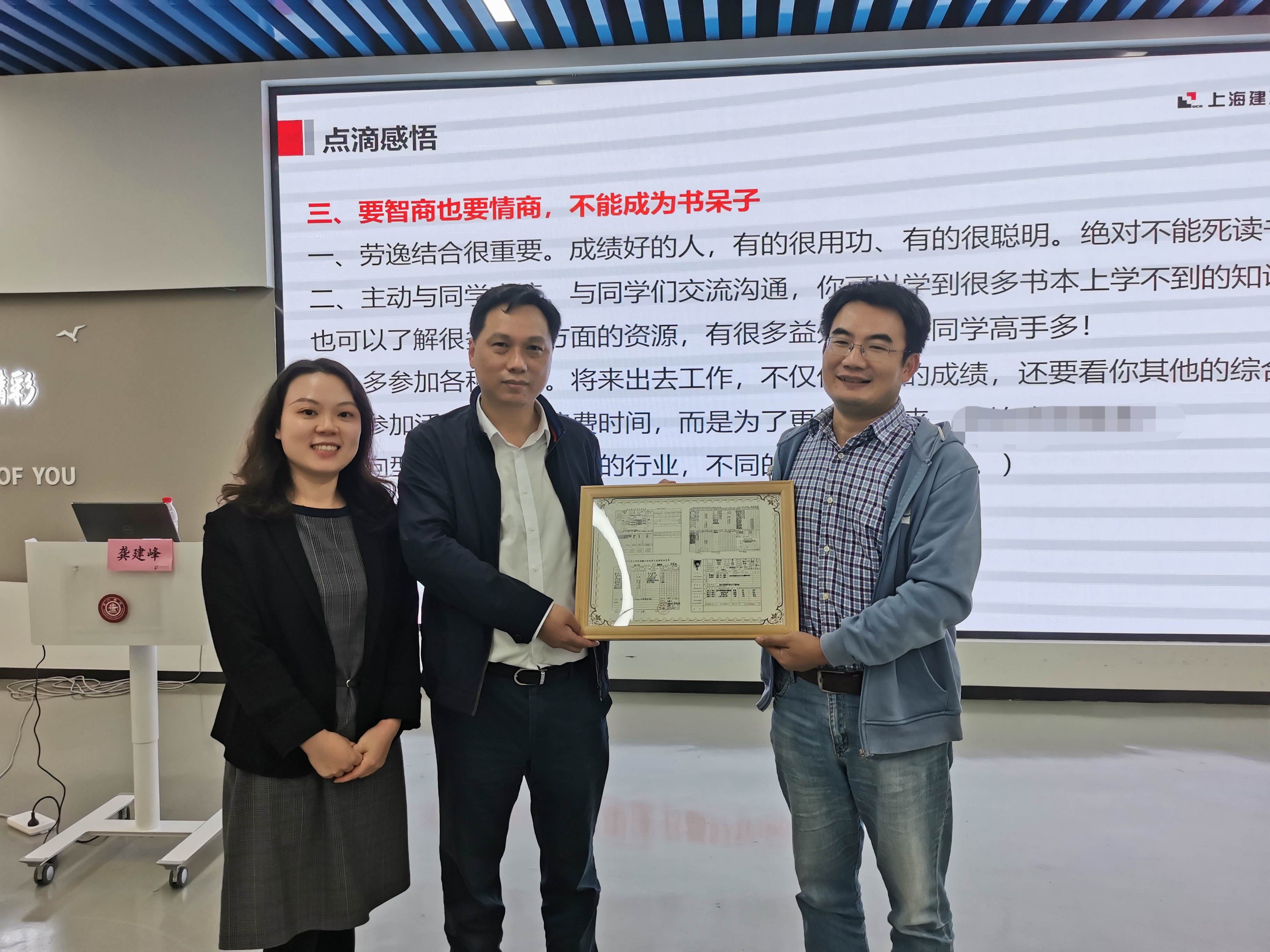 提问环节结束之后,刘铸永为龚建峰送上学院准备的一份特别纪念品——存有学长本科和研究生阶段的学籍表和留存成绩单,表达诚挚感谢与祝福。