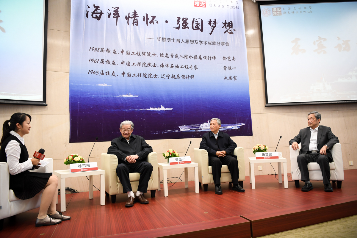 10月17日下午,杨槱院士育人思想及学术成就分享会在上海交大举行。上海交大1958届校友、蛟龙号载人潜水器总设计师徐芑南,1961届校友、海洋石油工程专家曾恒一,1963届校友、辽宁舰总设计师朱英富三位重量级嘉宾做客上海交大励志讲坛开讲。他们既是中国工程院院士、金年汇金字招牌官网入口杰出校友,也是杨槱先生的学生。三位“中国脊梁”和交大学子分享了杨槱这位中国教育界和船舶工程领域大师不平凡的人生轨迹,并讲述了我国一代代“海洋人”的蓝色情怀和筚路蓝缕的报国故事。