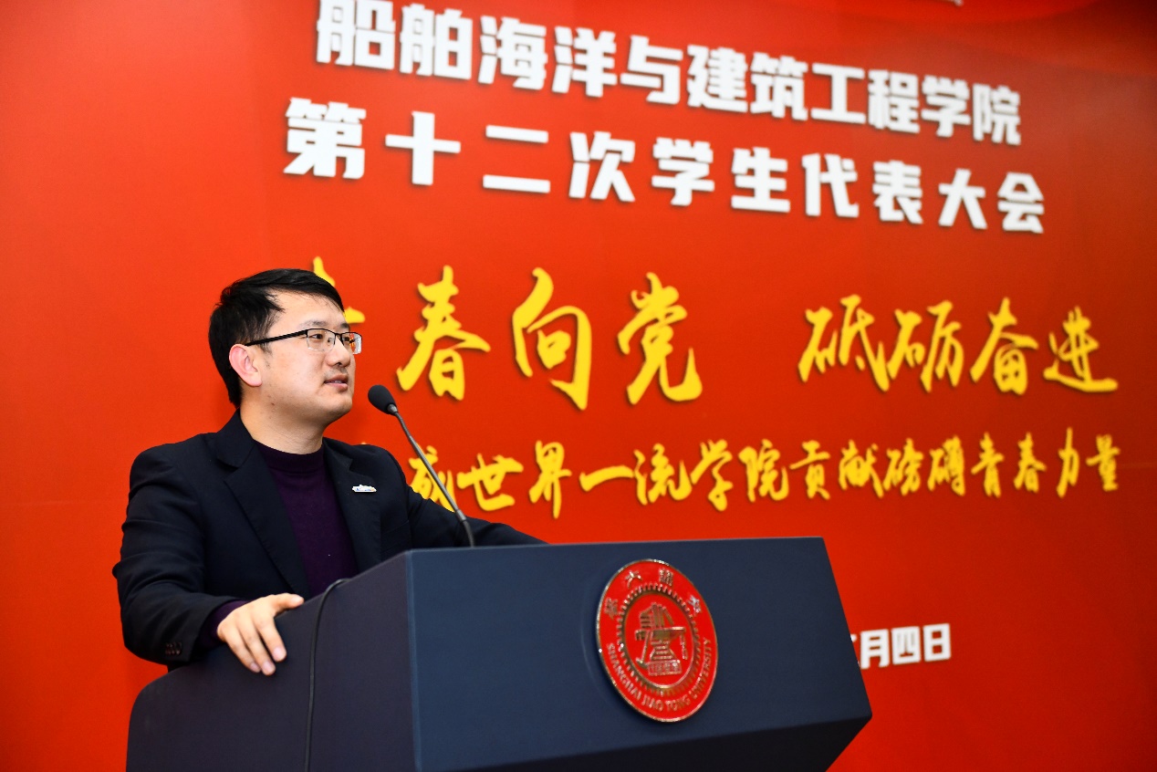 出席大会的嘉宾还有机械与动力工程学院团委副书记戴雨吟、电子信息与电气工程学院团委副书记刘张鹏、数学科学学院团委书记李欣、化学化工学院团委书记姚又华、生命科学技术学院团学工作负责人林魁、药学院团委书记高杏、人文学院团委书记董健鑫、安泰经济与管理学院团委书记范恒、凯原法学院团委书记谢焕、媒体与传播学院团委书记张羽慧、材料科学与工程学院团委副书记徐圆融、巴黎高科卓越工程师学院团委副书记彭冠锦。船建学院思政教师赵恺、张奕民、梁晴雪,辅导员魏威、王婷、吴佳妮也参加了本次大会。