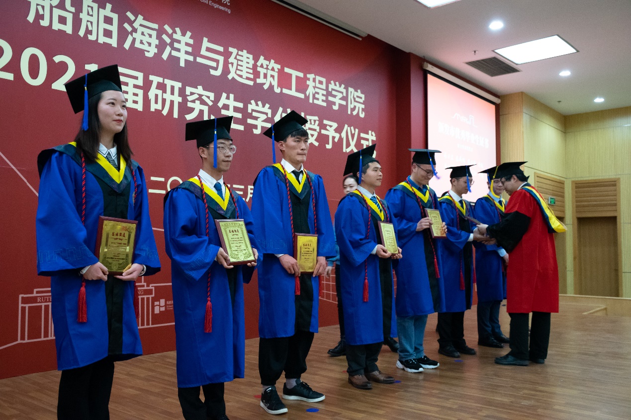 辽宁舰总设计师、中国工程院院士、学院知名院友朱英富学长,学院党委书记周薇,副书记宋续明,副院长杨健,副院长、船舶与海洋工程系系主任薛鸿祥,副院长、工程力学系系主任王本龙,院长助理、船舶与海洋工程系副系主任王鸿东,工会主席、工程力学系副系主任刘铸永,土木工程系系主任陈锦剑,交通运输工程系副系主任杜守继,导师代表、土木工程系教授周岱,研究生教务办主任刘蓉洁,校友工作负责人魏燕,2021届研究生年级思政查芳灵、蒋雨航、史舒婧,以及200余位毕业生出席。仪式由学院党委副书记宋续明主持。