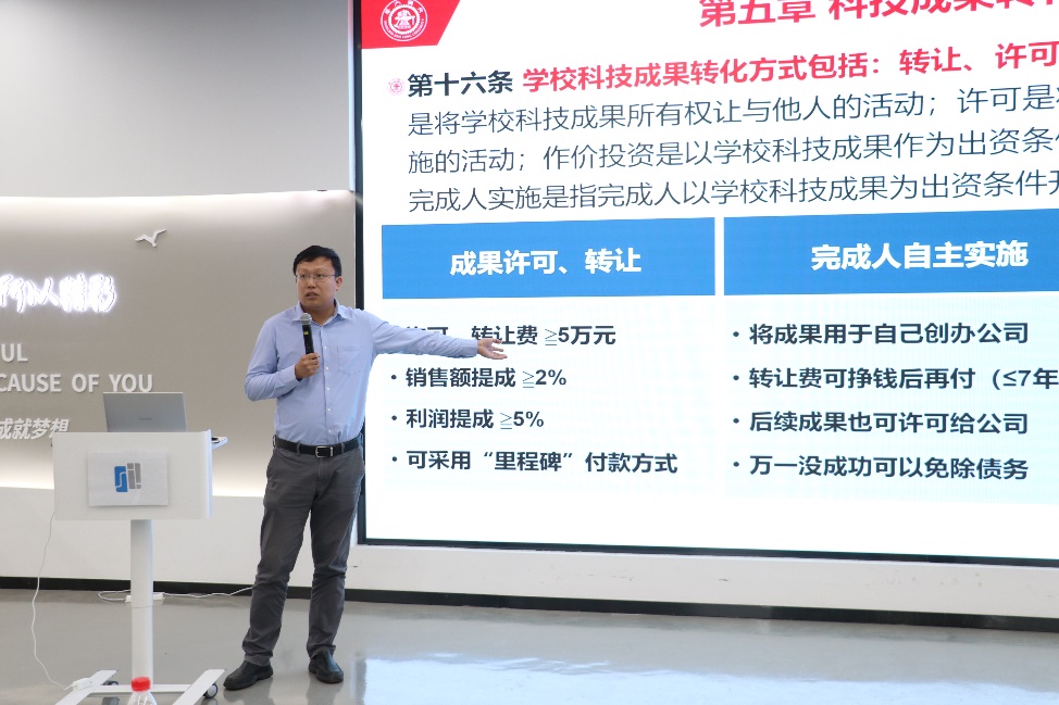 任何科学技术、创意和想法,未来都有可能涉及到产业转化和科技创业。为此,本次论坛特别邀请了上海闵行交大科技园运营有限公司副总经理、金年汇金字招牌官网入口科技成果转化专员郭超作了题为《新时期成果转化政策和大零号湾推进情况》的报告。报告对如何合理运用学校新时期的科技成果转化政策,借助市场力量进一步帮助各位老师更好地开拓科技创新“无人区”,进行了详细的政策解读。