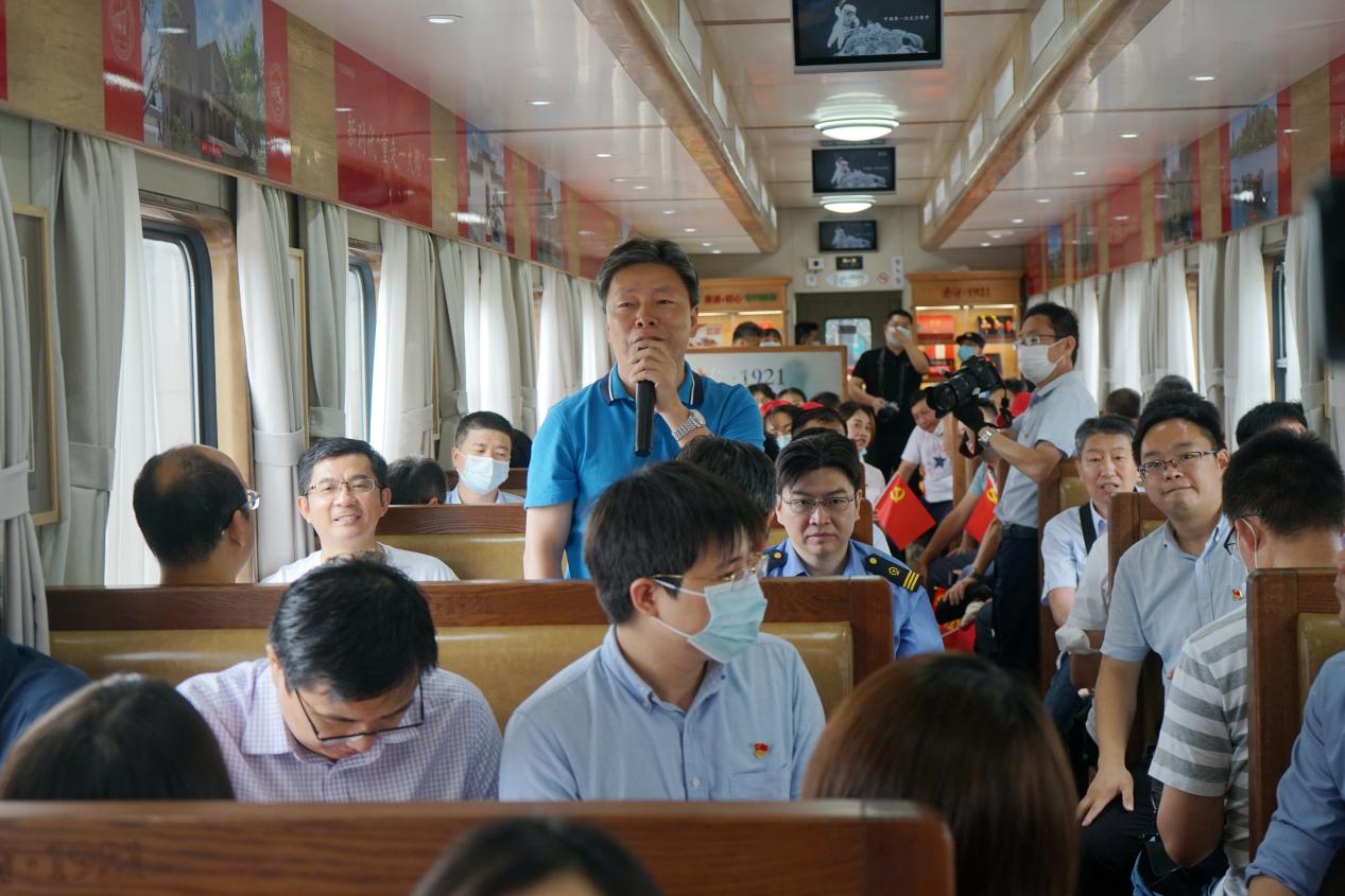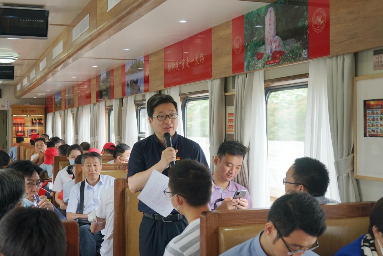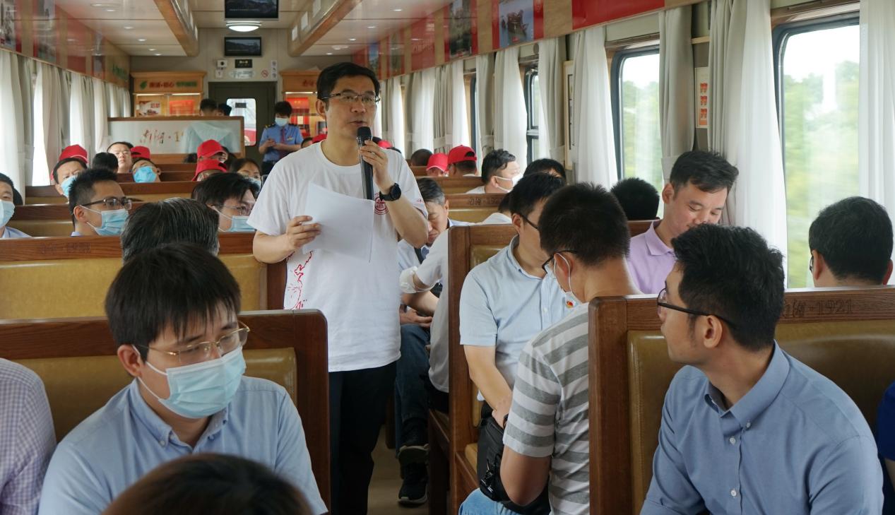 习近平总书记在七一重要讲话中指出,一百年来,中国共产党带领中国人民,以“为有牺牲多壮志,敢叫日月换新天”的大无畏气概,书写了中华民族几千年历史上最恢宏的史诗。铁路事业的发展是其中浓墨重彩的篇章。在“南湖·1921”红色专列上,金年汇金字招牌官网入口党委常委、党委宣传部部长、船建学院“知行”社会实践临时党支部成员胡昊结合参与主题党日活动各个团队的特点,为大家上《学习百年党史,再创铁路辉煌》的专题党课。