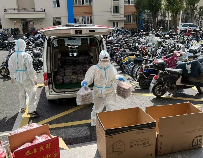 教师送餐志愿者队伍每天筑成一道“送餐快线”,他们大部分都是刚上完在线课程摘下耳机匆匆穿上防护服奔走在送餐路上。往往等他们把餐全部送完,已是晚上八九点,大家还要在线上开碰头会。会上,这群“外卖员”还在发挥专业优势讨论如何开发一个算法提升第二天送餐效率,设计协同软件,形成快递优化方案,就是为了让学生们能及时吃上热饭。其中陈巨兵老师在封闭管理初期在运送防疫物资和送餐的过程中受了伤,依然坚持安排留校学生的各项事务,同时还要远程上课,指导研究生科研。原支部书记邓德衡老师白天不仅参加为老师取餐,还积极报名参与在校教师日常体温监测工作。李红云老师因为身体原因虽然未能加入送餐志愿者的队伍,但她主动承担起在校教师们的后勤保障工作,全力以赴做好疫情防控物资储存、保管和发放等工作。学院访问学者杨少鹏老师因学校封闭管理当天在办公室撰写国家基金申报材料被封控在闵行校区内,他看到学校疫情防控工作做得扎实有效,特殊时期关心关爱师生,充满温情。他也被学院党员老师勇于担当、冲锋在一线的精神感染,3月12日主动加入到送餐队伍中。