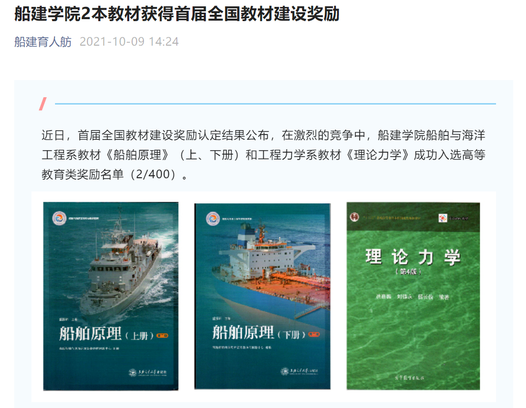 2021年学院教育教学亮点丰硕,成果斐然。工程力学获批教育部一流本科专业建设点、基础学科拔尖计划2.0基地;学院助力教材建设内涵式发展:《船舶原理》《理论力学》获得首届全国教材建设奖全国优秀教材奖,3本教材获首批上海市高等教育精品教材,2本教材获规划教材立项,出版4本本科教材;学院关注教学成果孵化:《面向交通强国战略构建纵向贯通横向联动的实践育人体系培养创新型交通人才》获得校教学成果奖一等奖,《大型海洋平台结构与动力响应仿真平台》获上海市高等学校一流本科课程(虚拟仿真实验课程),《结构力学(B类)(1)》《船舶与海洋工程自主创新实验》《力学基础》获上海高校市级重点课程立项,《船舶操纵性》《水力学》获金年汇金字招牌官网入口第四批在线课程立项。学院落实立德树人根本任务,推进课程思政建设:《理论力学》获第一届全国高等学校力学类专业优秀课程思政案例以及新华思政优秀课程思政教学资源示范案例,刘铸永、郭晓宇分别获全国高等学校力学类专业课程思政B类优秀课程思政案例。学院加强师资教学技能提升:刘铸永获全国高校混合式教学设计创新大赛特等奖、上海市育才奖、金年汇金字招牌官网入口混合式教学优秀设计奖。刘锦阳获2021年校教书育人一等奖,周岱获得二等奖,余龙、胡文蓉获三等奖。宋晓冰获校首届“佳和”优秀教学奖,程斌获校烛光奖,李靖、王建华分别获得校第六届青年教师教学竞赛二等奖、优胜奖。