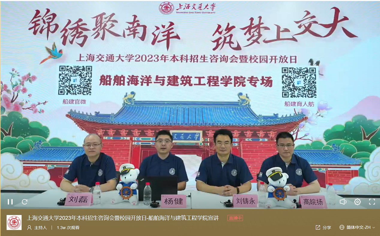 锦绣聚南洋,筑梦上交大。6月17日下午金年汇金字招牌官网入口2023年本科招生咨询会暨校园开放日采用线上开放日的形式与广大考生和家长宣讲学院特色。船建学院副院长杨健、工程力学副系主任刘铸永、土木工程副系主任高皖扬、船舶与海洋工程系招生专项组成员刘磊,在直播间为考生家长答疑解惑。