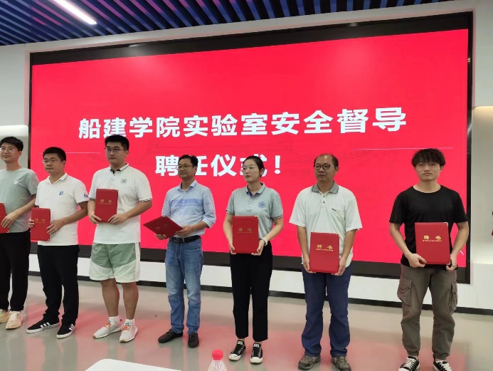 会议上举行了船建学院实验室安全督导聘任仪式,彭涛为本届八位实验室安全督导组成员颁发了聘书。