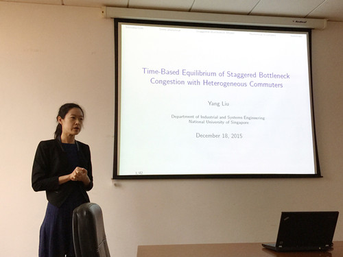 12月18日下午,新加坡国立大学工业与系统工程系助理教授刘杨应邀到船建学院国际航运系,举办了主题为“Time-Based Equilibrium of Staggered Bottleneck Congestion with Heterogeneous Commuters”的学术报告会。国际航运系教师谢驰、倪安宁、史小宁以及20余名学生参加了此次报告会。