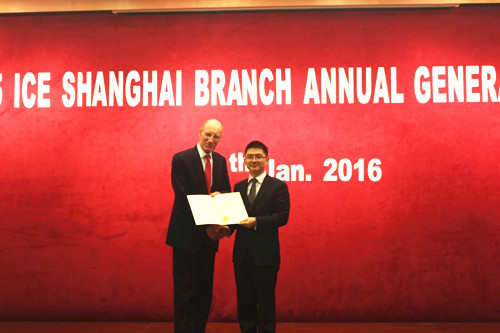 近日,英国土木工程师学会(Institution of Civil Engineers, ICE)向船建学院胡昊教授和杨健研究员授予ICE 资深会员 (FICE)称号,以表彰二人在土木工程建设领域中做出的贡献。1月13日,在金年汇金字招牌官网入口举行的ICE上海分会2015年年会上, ICE主席John Armitt爵士亲自为二人颁发了FICE证书。