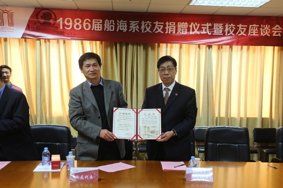 同一时刻,95届船海系校友捐赠仪式也在木兰船建大楼A1006举行,黄亚雄、唐震峰、庆宇峰、葛春花等95届校友及部分船舶与海洋工程系本科二年级学生出席了捐赠仪式,仪式由船舶与海洋工程系系主任汪学峰主持。学院党委副书记李巍与校友代表葛春花共同签署了捐赠仪式,并向校友们颁发了捐赠证书。