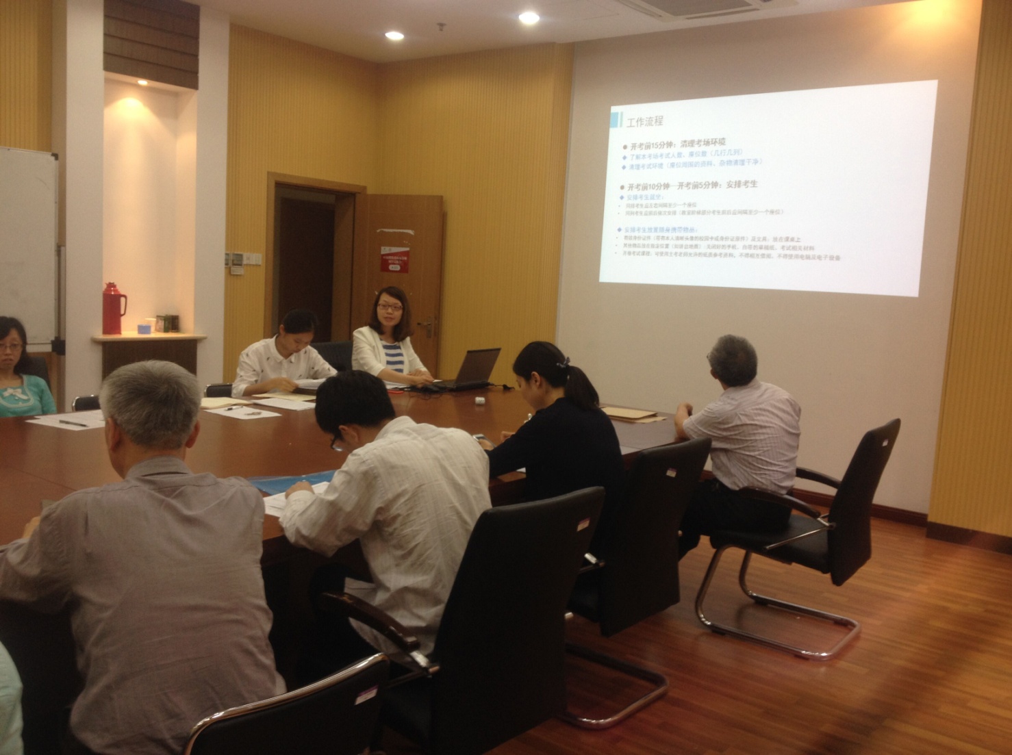 彭术连介绍了监考人员工作须知、监考工作流程、特殊情况处理等内容,提醒老师注意正式开考前、考试过程中和考试结束前后的各项工作要点和工作细节,并特别强调主考老师和监考老师应提前15分钟到考场,严格遵守主考人员和监考人员工作规范。会上,各位主考、监考老师认真学习了学校关于监考工作的各项规定,并对个别疑问之处进行讨论和交流。