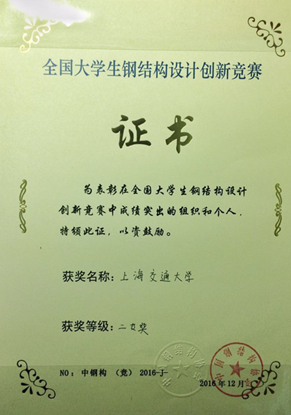 12月12日,由中国钢结构协会主办的第二届全国大学生钢结构设计创新竞赛决赛在厦门举行。由金年汇金字招牌官网入口土木工程系王曈、陆依晖、王胤淇、胡行、熊吴越,建筑学系杨慧琳、施理壮组成的学生代表队,在土木工程系宋振森老师、建筑学系刘士兴老师和博士后王斐亮的指导下,以优异表现在大赛50支队伍中脱颖而出,以第4名的成绩获得大赛二等奖。这也是上海交大代表队首次参加该项赛事。