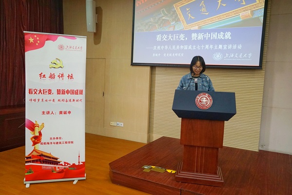 10月28日下午,船建学院红船讲坛第十期在新行政楼B418顺利召开。校党史校史研究室研究员龚诞申老师做客本期讲坛,以“看交大巨变,赞新中国成就”为题,为同学们带来庆祝中华人民共和国成立70周年的主题讲座。本次讲坛由学院党建指导老师古莉主持,学院2019级新生、入党积极分子和部分学生党员参加了此次活动。