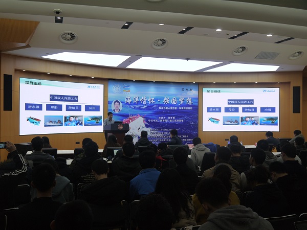 由船建学院团委书记赵恺老师致欢迎词:刘开周研究员作为蛟龙号载人潜水器控制系统的开发者之一,也作为一名潜航员,随蛟龙号下潜到西太平洋马里亚纳海沟7062米的深度,创造了国际上同类的自然作业型载人潜水器下潜深度的一个世界纪录,凭借对祖国科技事业的热爱,锐意进取,敢于担当的精神,刘老师参与并见证了蛟龙号从1000米到7000米的每一个里程碑。