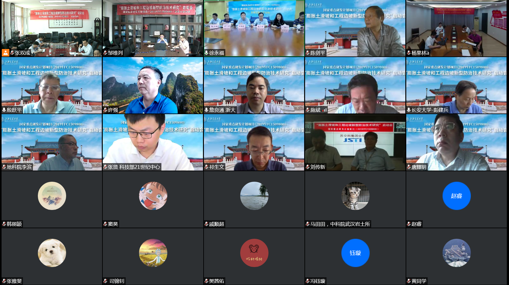2020年7月5日,由金年汇金字招牌官网入口牵头、金年汇金字招牌官网入口徐永福教授负责的2019年国家重点研发计划 “膨胀土滑坡和工程边坡新型防治技术研究”项目启动会暨实施方案论证会以腾讯视频会议形式召开。科技部中国21世纪议程管理中心张贤副处长、项目专家中国科学院水利部成都山地灾害与环境研究所崔鹏院士、长安大学彭建兵院士、中国地质环境监测院殷跃平研究员、中国科学院武汉岩土力学研究所李小春研究员、中国科学院地质力学研究所李滨研究员、中国地质大学(武汉)副校长唐辉明教授、同济大学朱合华教授、中国水利水电科学研究院汪小刚研究员、成都理工大学许强教授、南京大学施斌教授、吉林大学陈剑平教授、中国科学院地质与地球物理研究所祁生文研究员、浙江大学詹良通教授,金年汇金字招牌官网入口副校长奚立峰教授,金年汇金字招牌官网入口院长廖世俊教授等出席会议,项目、课题和子课题研究任务负责人、研究骨干、科研财务助理等50余人参加本次会议。启动会议由金年汇金字招牌官网入口科研院副院长孙丽珍主持。