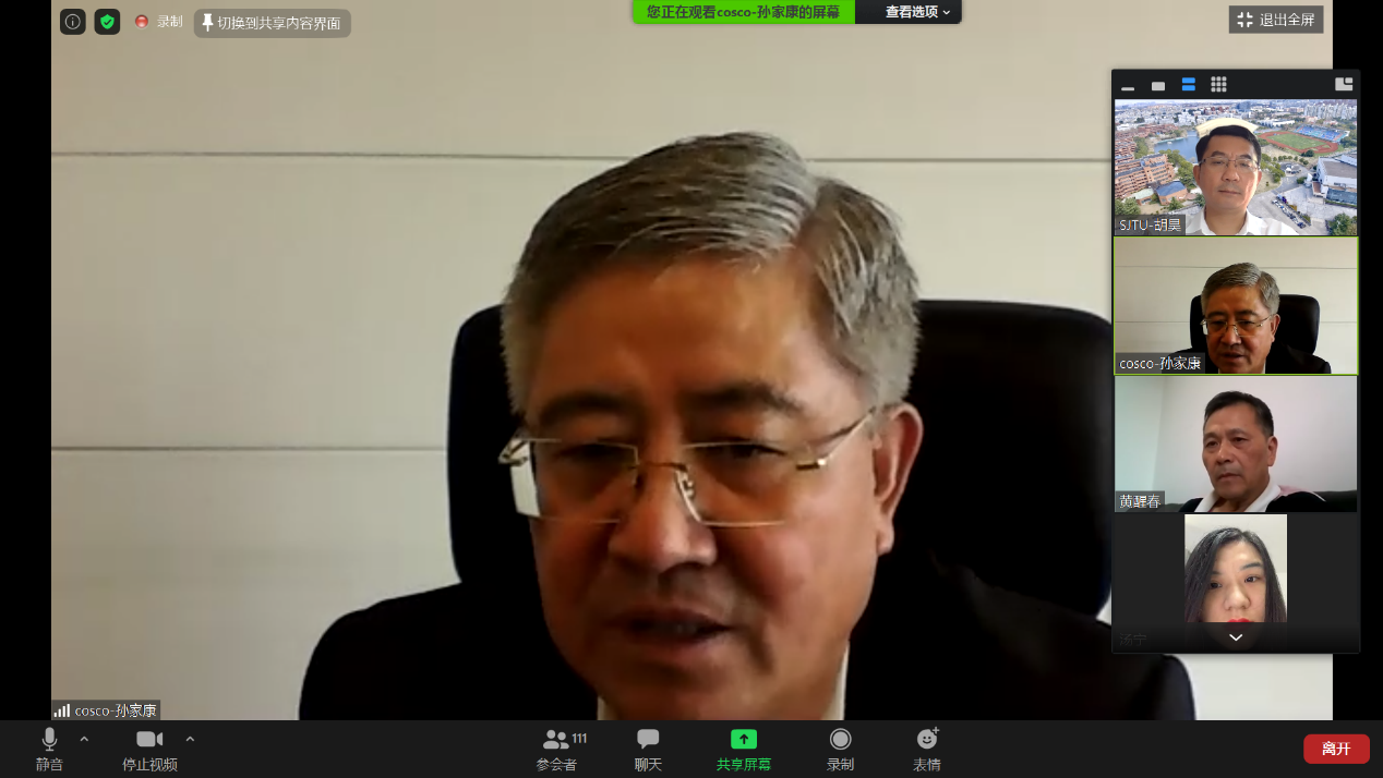 8月25日,船建学院交通运输工程系举办了“天地交通·云端讲堂”第四期在线学术讲座。本次在线学术讲座邀请了上海市政协经济委员会副主任委员,中国远洋海运集团原党组副书记、董事孙家康先生主讲。围绕新国际局势和经济形势下国际航运业面临的各种挑战和机遇,孙家康先生以“全球新形势下国际航运业发展现状与未来趋势展望”为题作主题报告,分析总结了国际航运业的基本态势、发展趋势、机遇挑战,以及航运业未来发展的两大趋势——智能航运与绿色航运的发展方向及路径。此次学术讲座共吸引了140多位交大师生线上参与,由船建学院黄醒春教授主持。
