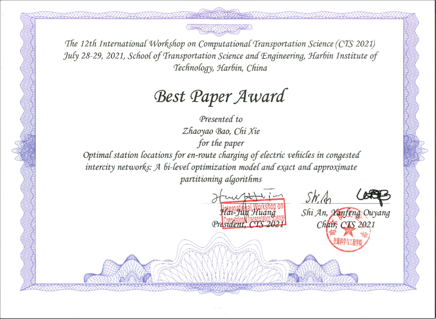 交通运输工程系学子荣获第十二届计算交通科学国际研讨会暨中国管理科学与工程学会交通运输管理分会年会最佳论文奖