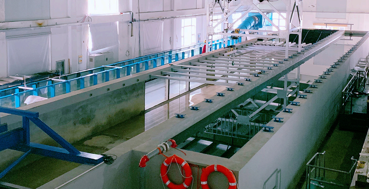 海啸波水池建成于2017年,同年投入使用。该水池通过可控的方式模拟海啸波传播至近岸时的变化过程,通过用长波和短波叠加的方式实现在实验室中模拟生成非破碎涌波的波浪形态,为研究海啸波传播时的演化过程,包括演化机理、能量损耗、波谱变化、对海岸结构物的作用等提供了有效的实验平台。同时,也可完成较大尺度的三维模型下波浪对海岸结构物的作用研究。